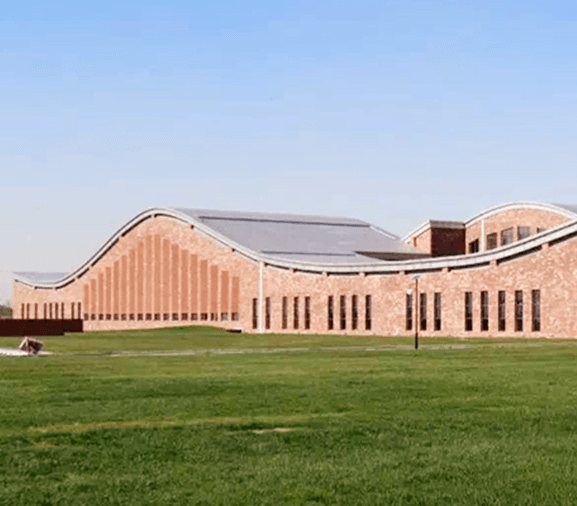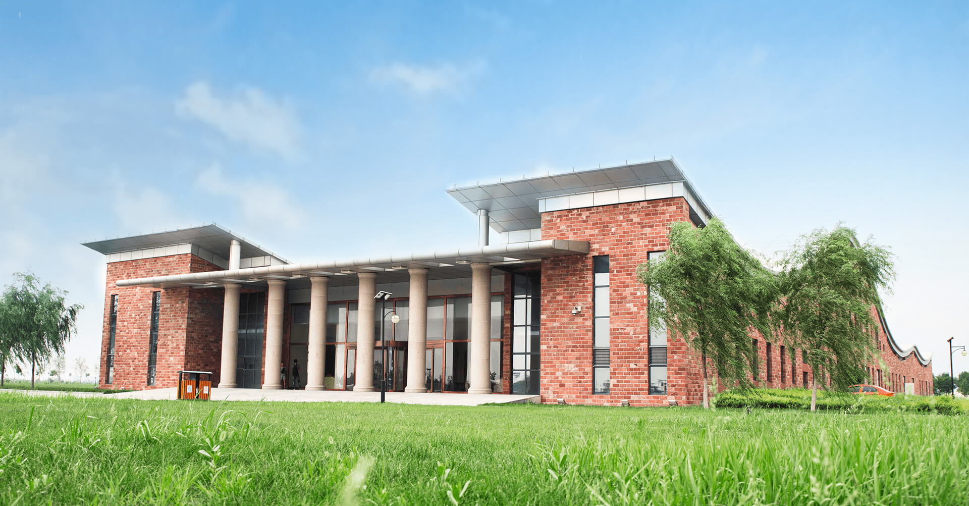 建筑立面深紅色花崗巖與光面磚相結(jié)合,營造流動的音樂符號形象。東立面作為廣場入口主里面注重空間層次多重化。細(xì)長的圓柱紅色的磚墻及通透的玻璃幕墻間層層透視直至內(nèi)庭院的圓形符號。西立面木格柵百葉側(cè)重點在光影變化。同時也為操作人員遮陰納涼。釀酒堡四周草叢映襯,白天是個巨大的雕塑,夜靜時則變成閃耀的會演奏的音樂家。在這里建筑是流動的、音樂是流動的、人是流動的…