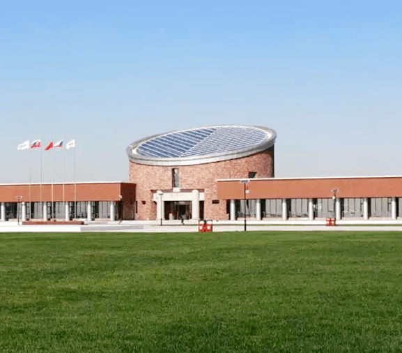 建筑中心的圓形來源于提煉的橡木桶的造型,它不僅僅作為藏酒器具,更被視為葡萄酒界身份和品位的象征。其是一種藝術(shù),一種文化,它已超越了其本身的意義。屋頂?shù)牟A粔⒆匀还饩€瀉入與建筑內(nèi)部相互融合。兩翼采用水平帶狀的幾何體與圓形主體之間形成對比,凸顯整個建筑的沉穩(wěn)大氣,尤其18根直徑0.9米圓柱更是將建筑的沉穩(wěn)達(dá)到極致,給游客帶來感官新體驗。落地窗的采用使立面虛實結(jié)合,同時與建筑南側(cè)的噴泉水池相互借景,你中有我,我中有你,交相輝映。