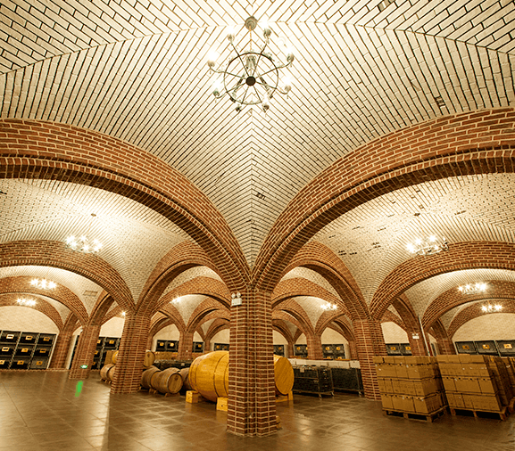 通過工業(yè)連廊和游客連廊與釀酒堡緊密相連,酒窖的拱券頂和地下走廊的拱券頂設(shè)計除了美化裝飾作用的同時,還有一種歷史的文化沉淀在里面??傮w布局采用環(huán)抱式與中央陣列布局式相結(jié)合,打造出歐式四角拱頂?shù)目臻g格局,打破傳統(tǒng)酒窖厚重的華麗風(fēng)格,通過白色碎小磚塊裝飾頂面與墻面,打造出地中海式簡約風(fēng)格的酒窖場所,為藏酒區(qū)環(huán)境和參觀者的內(nèi)心共同創(chuàng)造了質(zhì)樸,輕松、雅靜的感覺!