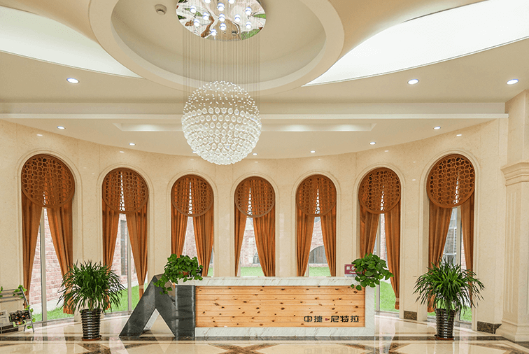 展覽館設(shè)置上人屋面可以布置綠化作為屋頂陽臺,俯瞰整個酒莊盡收眼底。誼盛軒室內(nèi)裝飾設(shè)計理念為:友誼與輝煌。